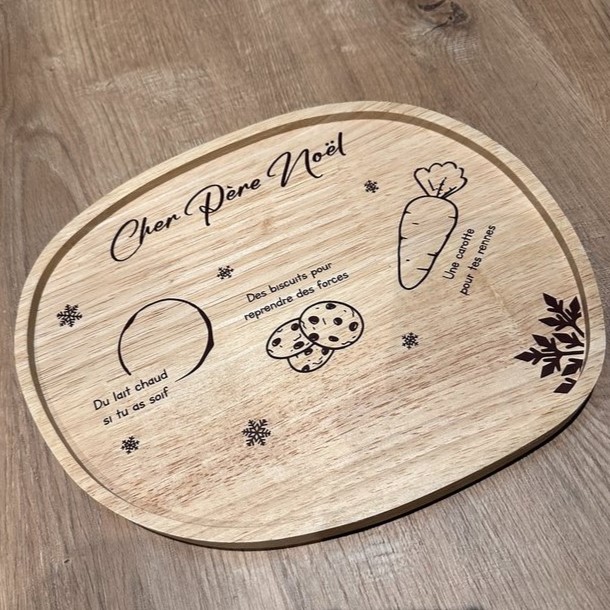Ajoutez une touche de magie à votre réveillon avec ce joli plateau personnalisé avec le(s) prénom(s) de votre choix, conçu pour accueillir un verre de lait chaud et des biscuits pour le Père Noël, ainsi qu’une carotte pour ses fidèles rennes. Disposez-le au pied du sapin et laissez la magie opérer.